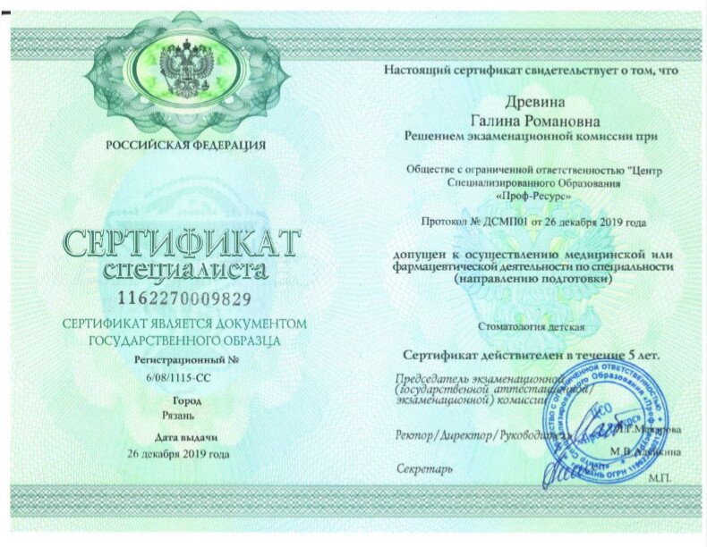 Древина Галина Романовна является стоматологом-терапевтом. Галина Древина в том числе проводит реставрацию зубов, эндодонтическое лечение, профессиональную гигиену полости рта и реминерализирующую терапию зубов, специализируется на заболеваниях полости рта, а также обладает знаниями и навыками в области эстетической реставрации зубов.